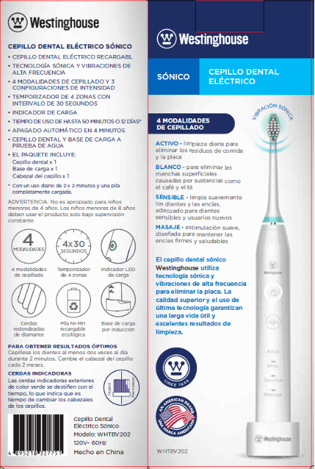 Westinghouse cepillo dientes eléctrico blanco recargable sonic WHTBV202